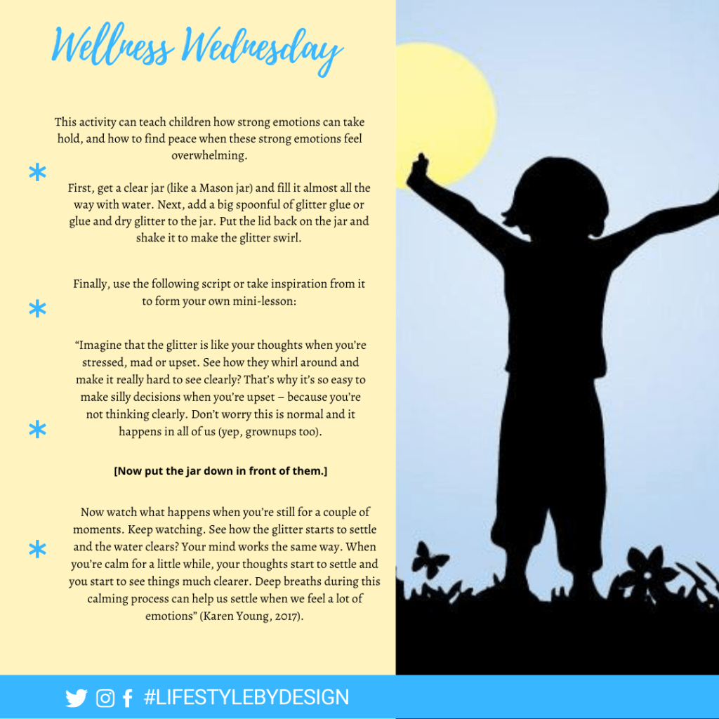 This exercise not only helps children learn about how their emotions can cloud their thoughts, but it also facilitates the practice of mindfulness while focusing on the swirling glitter in the jar.
